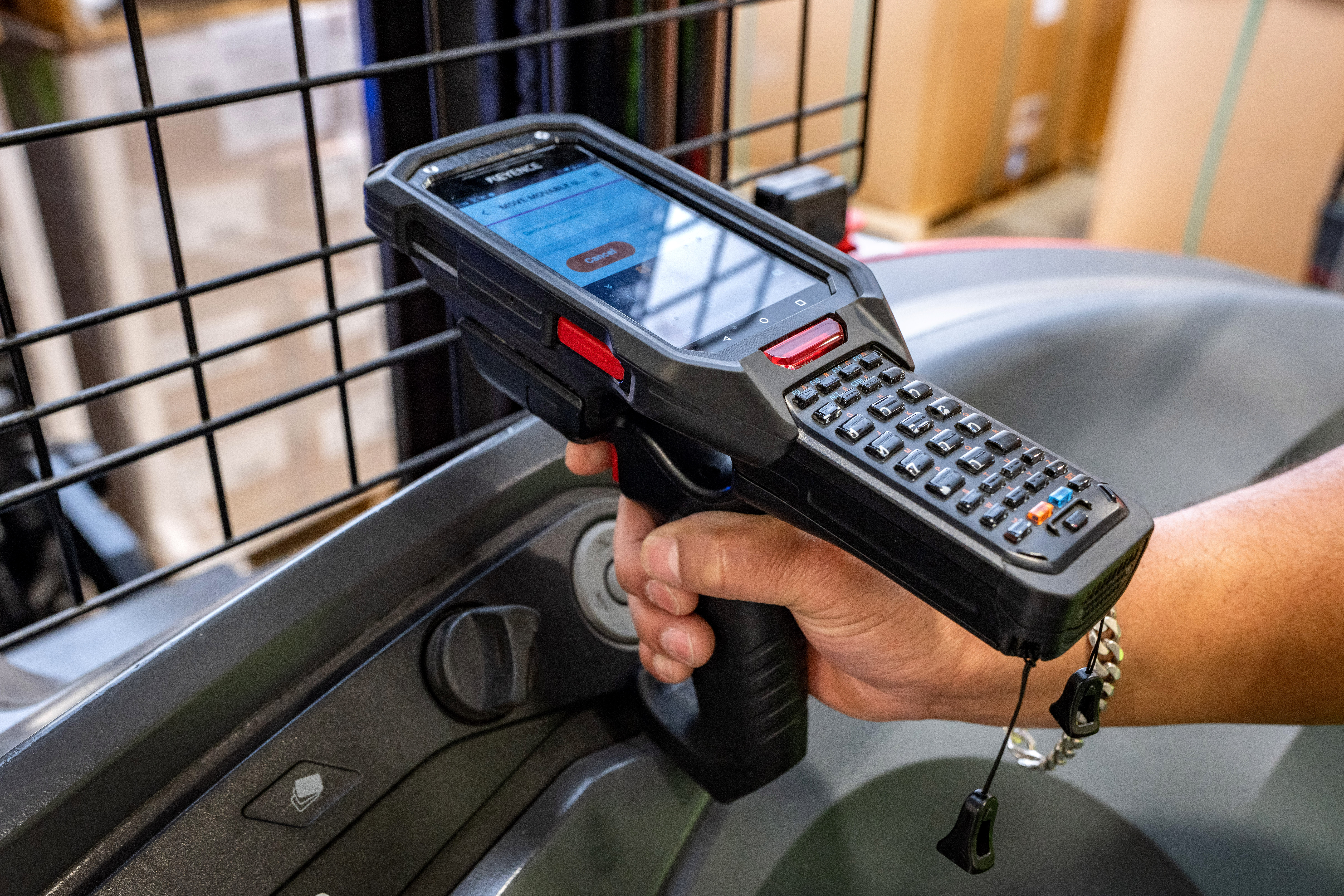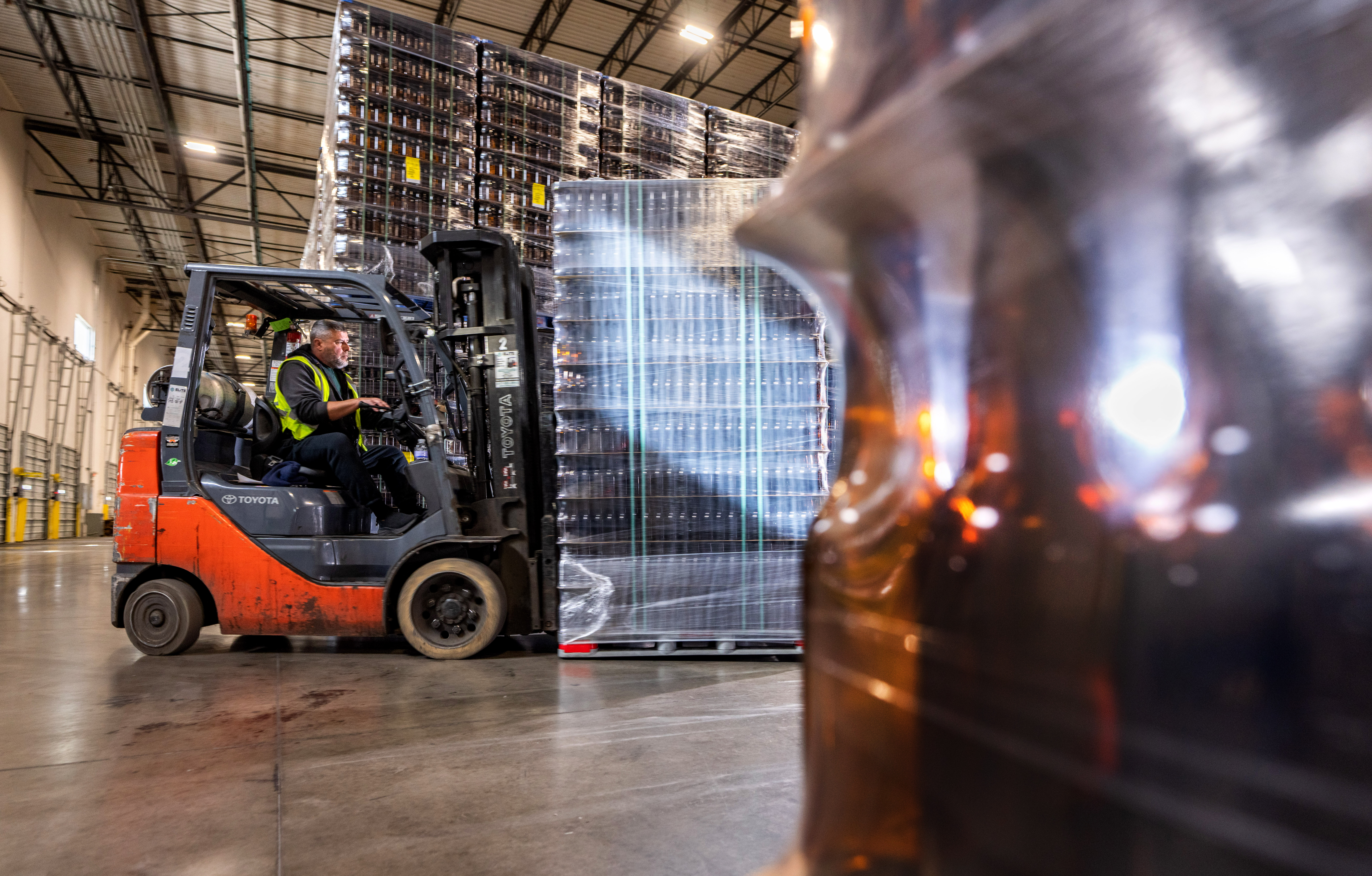 • A forklift moves inventory to the top rack of a warehouse